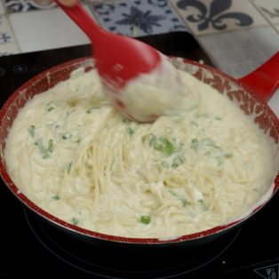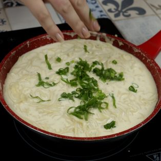 9.Adicione a água do cozimento e logo em seguida a cebolinha.
