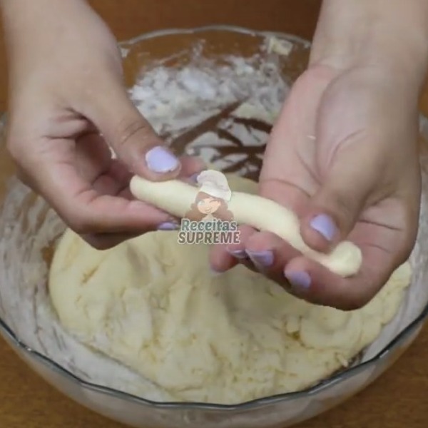 Coloque a massa sobre uma pedra e amasse, adicionando polvilho aos poucos até começar a soltar das mãos e da pedra. Esse é o ponto. Agora enrole a massa fazendo biscoitinhos não muito grossos pois ela cresce ao fritar.