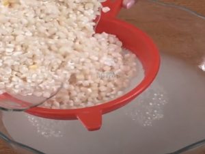 Logo depois, com o auxílio de uma peneira, retire somente os grãos da canjica e descarte a água.