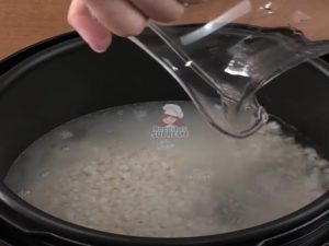 Em seguida, você irá precisar de uma panela de pressão elétrica ou tradicional, coloque a canjica com 1 litro de água e deixe cozinhar por 30 minutos.
