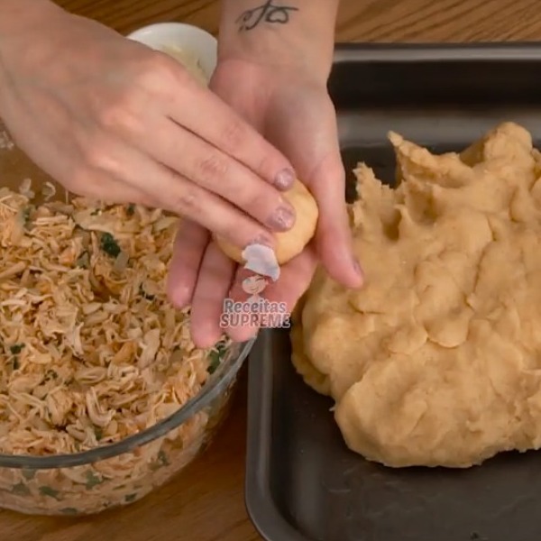 Posteriormente, espalhe trigo sobre a mesa e sove a massa da coxinha por alguns minutos, unte as mãos com margarina e inicie o processo de montagem das coxinhas pegue um pouco de massa faça uma casinha, adicione o frango e modele em formato de coxinha, repita o processo com toda massa.