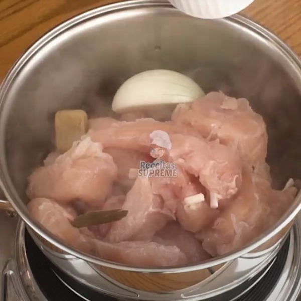 Logo depois, inicie o recheio, em uma panela adicione o frango, as folhas de louro, um caldo de galinha, a cebola e o alho, o sal e a pimenta, cubra com água e deixe cozinhar.