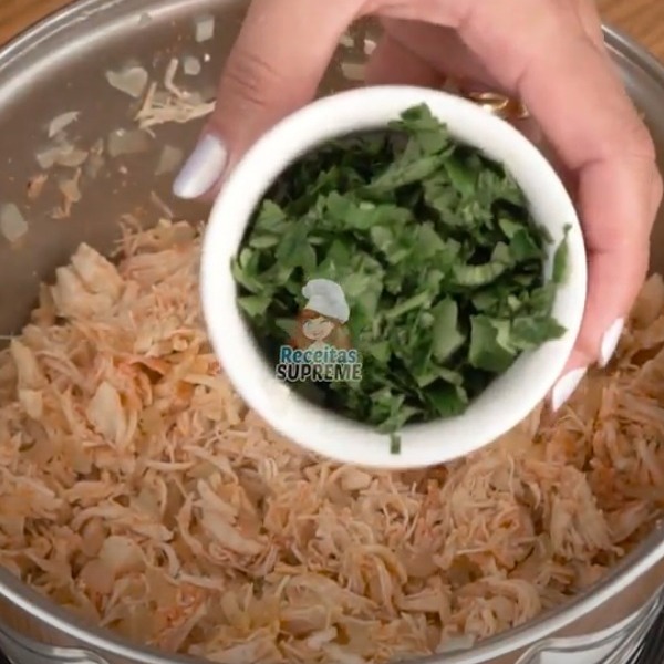 Retire o frango e desfie, inicie o processo de refogar, na panela inclua o azeite, a cebola e o alho, refogue e junte o frango adicione o sal e a pimenta, o colorau, e o cheiro-verde reserve até esfriar.