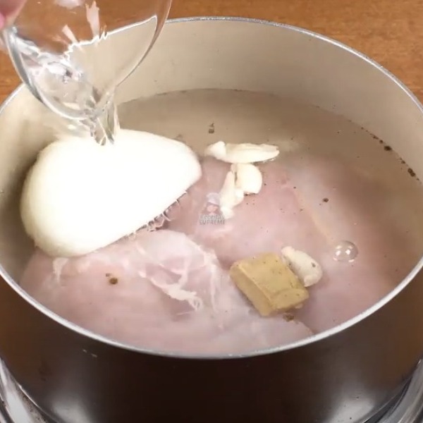 Inicialmente, em uma panela adicione o peito de frango, e metade de uma cebola e dois alhos cortados ao meio, o sal e a pimenta, 1 caldo de frango e cubra com água.