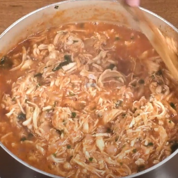 Depois, em uma panela em fogo médio, adicione 1 fio de azeite a cebola e o alho, refogue por alguns minutos, inclua o frango desfiado e mexa bem, corrija o sal, coloque a mostarda, o tempero caseiro, e o colorau mexa bem, junte o cheiro-verde.