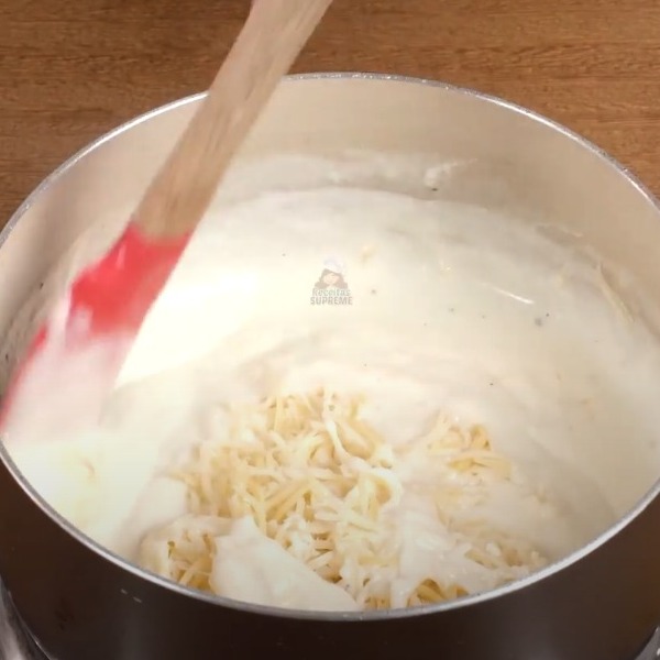 Posteriormente, adicione molho de tomate, e uma xícara de água, espere ferver e reserve, em uma panela em fogo baixo coloque a manteiga e o trigo e mexa até formar um creme, inclua o leite e mexa até incorporar tempere com noz-moscada e pimenta.
