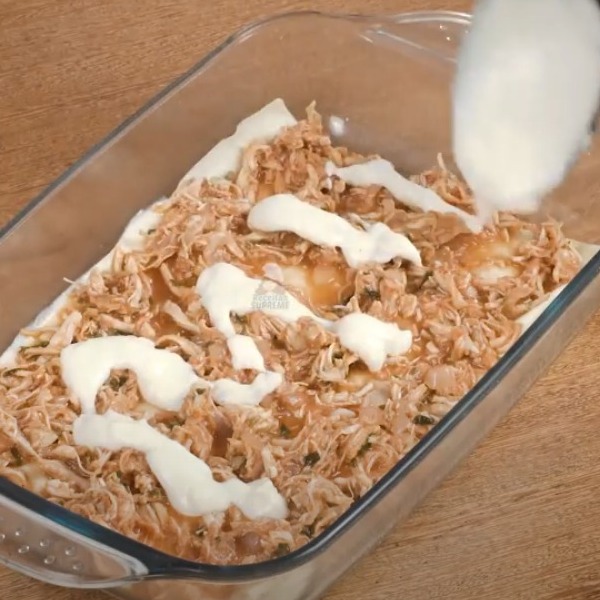 Para finalizar, em uma tigela adicione o molho branco no fundo, por cima a massa de lasanha, fazer uma camada de frango , mais um pouco do molho branco e cobrir com queijo mussarela fatiado.