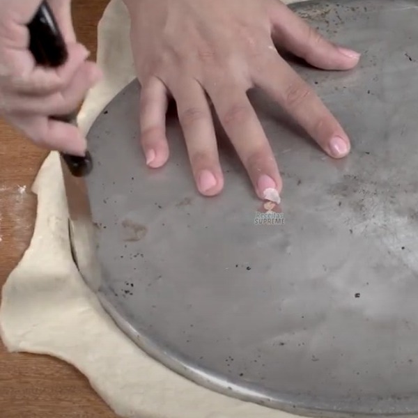 Posteriormente, use a forma de pizza para marcar o tamanho , pressione e com a ajuda de uma faca marque o tamanho que deseja. O restante da massa você pode sovar abrir novamente e montar outra pizza, untei a forma com azeite.