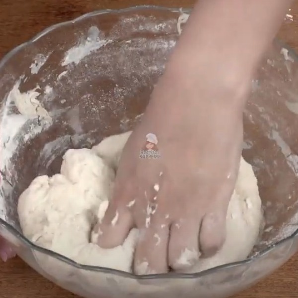 Em seguida, vá adicionando o trigo aos poucos e mexendo bem, quando desgrudar do recipiente mexer com as mãos, coloque um pouco de trigo na bancada e sove a massa até ficar lisa.
