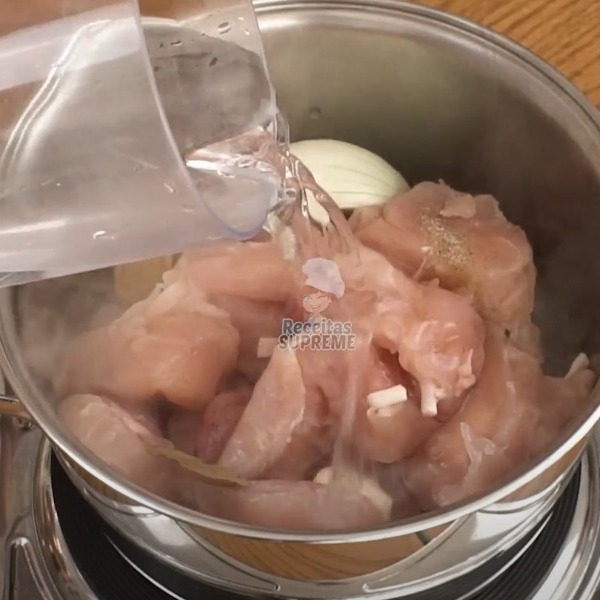 Para iniciar, em uma panela coloque o filé de frango, a folha de louro, o caldo de galinha, meia cebola, dente de alho, sal e pimenta a gosto cubra com água e deixe cozinhar, até que o frango esteja cozido. Escorra o frango e deixe esfriar.