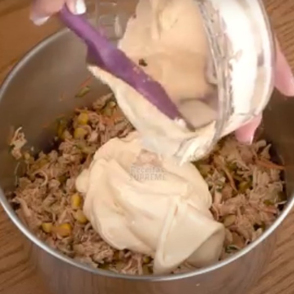 Posteriormente, adicione o pepino, a cenoura ralada e o milho por último adicione maionese, mexa para misturar.
