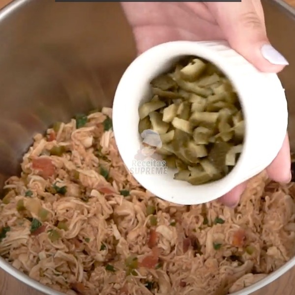 Em seguida, coloque o frango desfiado na panela, mexa para misturar molho e frango, adicione a salsinha e a cebolinha picada. Tire do fogo e coloque em uma vasilha.