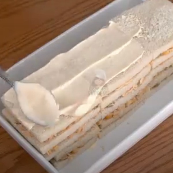 Inicie o processo de montagem, em uma travessa, passe um pouco de maionese que vai servir para segurar a primeira camada de pão. Coloque as fatias de pão sem casca, adicione o frango e cubra com mais uma camada de pão. Passe um pouco de leite no pão e coloque frango.