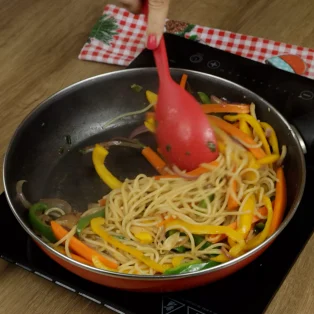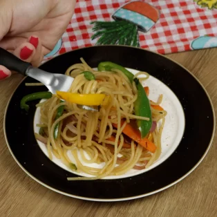 Unte uma frigideira com um fio de azeite e nela despeje o macarrão junto dos legumes. Ponha 1 colher de chá de sal e 1 de pimenta preta, adicione também molho de pimenta a gosto, 2 colheres de molho de soja e misture bem tudo.