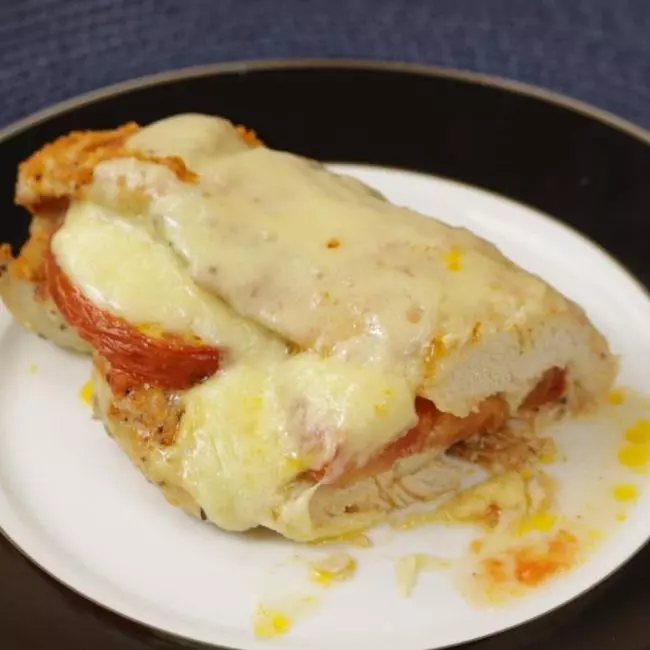 Por fim, leve ao forno somente para derreter o queijo de cima e pronto. Só servir sua receita de frango. Bom apetite!