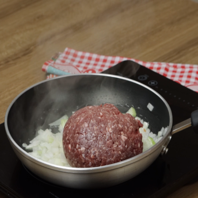 No início, em uma frigideira antiaderente coloque o óleo, a cebola e o alho. Deixe refogar por alguns minutos e coloque a carne moída.