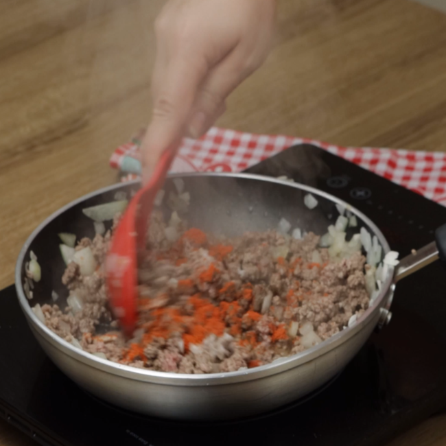 Em seguida, mexa por alguns minutos até que esteja bem refogado. Depois, tempere com sal, páprica e molho de tomate, misture bem.