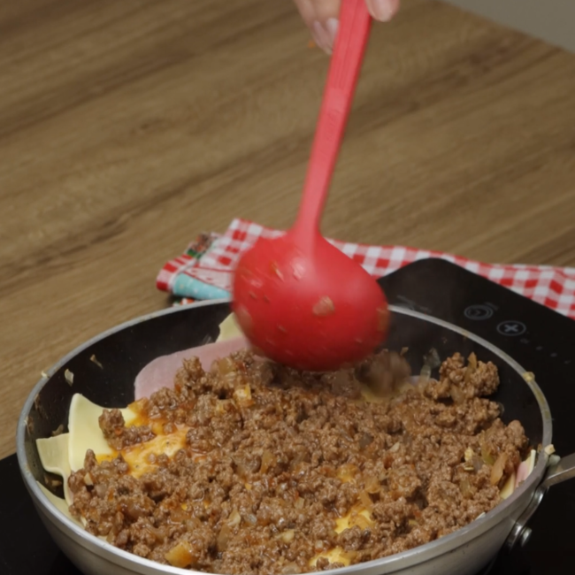 Na sequência, retire uma boa quantia de carne moída reservando o restante e deixando um pouco na frigideira. Então, inicie a montagem da lasanha, coloque uma camada de lâminas de lasanha, presunto, queijo e carne moída.