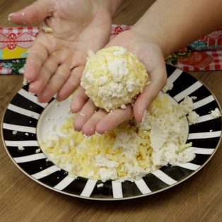 Sove bem a massa, recheie com o queijo e feche a massa.