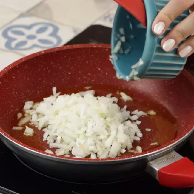 No início, em uma tábua de cortar pique a cebola, o pimentão e o tomate. Depois, coloque tudo em uma frigideira com azeite de oliva e deixe refogar por alguns minutos.
