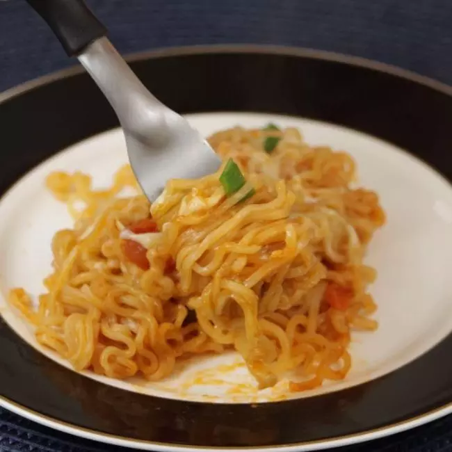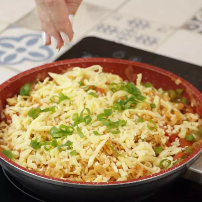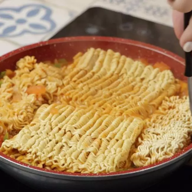 Logo depois, coloque os miojos espalhados na frigideira com o molho, tampe e na medida que forem cozinhando vá mexendo com auxílio de um garfo.
