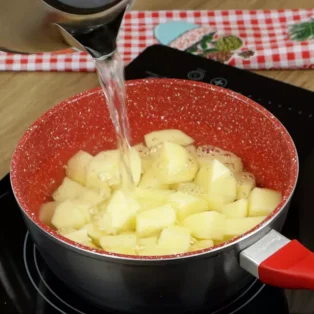 Em uma panela, coloque para cozinhar 3 batatas médias, temperando com sal à gosto.