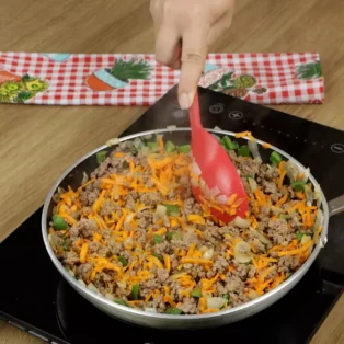 Unte uma frigideira com azeite e coloque para fritar 1 cebola, ½ pimentão e 400 gramas de carne moída. Tempere tudo com 1 colher de sal, 1 colher de pimenta preta, 1 colher de páprica e depois adicione 1 cenoura ralada e coentro.