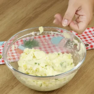 Coloque as batatas cozidas em uma tigela de vidro e as amasse, depois de amassadas adicione salsa a gosto, 1 colher de sal, 1 colher de pimenta preta e 100 gramas de queijo muçarela.