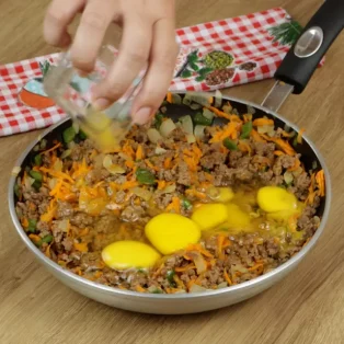Na frigideira com a carne, adicione 4 ovos crus e misture bem tudo.