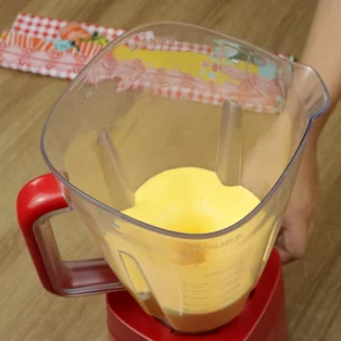 Para dar início ao preparo, você deve primeiramente bater no liquidificador, 3 ovos, ½ xicara de azeite e 1 e ½ xicaras de cenoura.