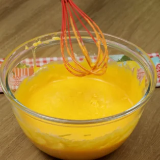 Transfira o liquido para uma tigela de vidro e adicione 1 e ½ xicara de açúcar refinado, misture bem e depois adicione mais 1 e ½ xicaras de trigo e 1 colher de fermento em pó e mexa bem tudo.