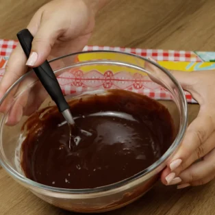 Derreta 200g de chocolate, adicione junto do chocolate derretido ½ xicara de creme de leite e ½ xicara de leite condensado e misture bem.