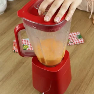 Para o primeiro passo você precisará utilizar um liquidificador, nele vamos por 1 xicara de cenoura picada, 1 ovo, 2 colheres de azeite, ¼ xicaras de açúcar, 2 colheres de água e bater tudo.