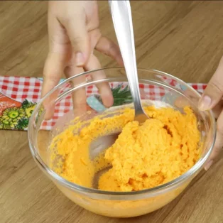 Despeje tudo em uma tigela de vidro e adicione ¾ de farinha e 1 colher de chá de fermento e mexa bem tudo.