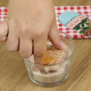 Por fim, em um potinho de vidro ponha 4 colheres de açúcar e 1 colher de canela.
